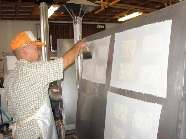 水切りをした和紙は、アルミ製の板に張り付け乾燥させる、ムラが出来ないように刷毛で整える。