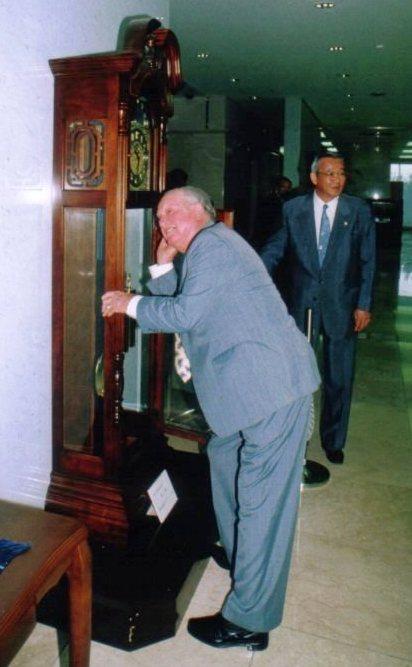 1999年 市役所玄関にある時計に再会してご機嫌のリー爺さん