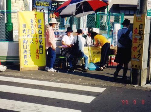 長年実現されることのない、急斜面で危険な長い南口の玄関 相武台駅の階段横のエスカレーター設置駅前で初の署名活動。会長(戸津信義)率いる小さな商店会一同、そして市民が一体となって起こした運動であった。